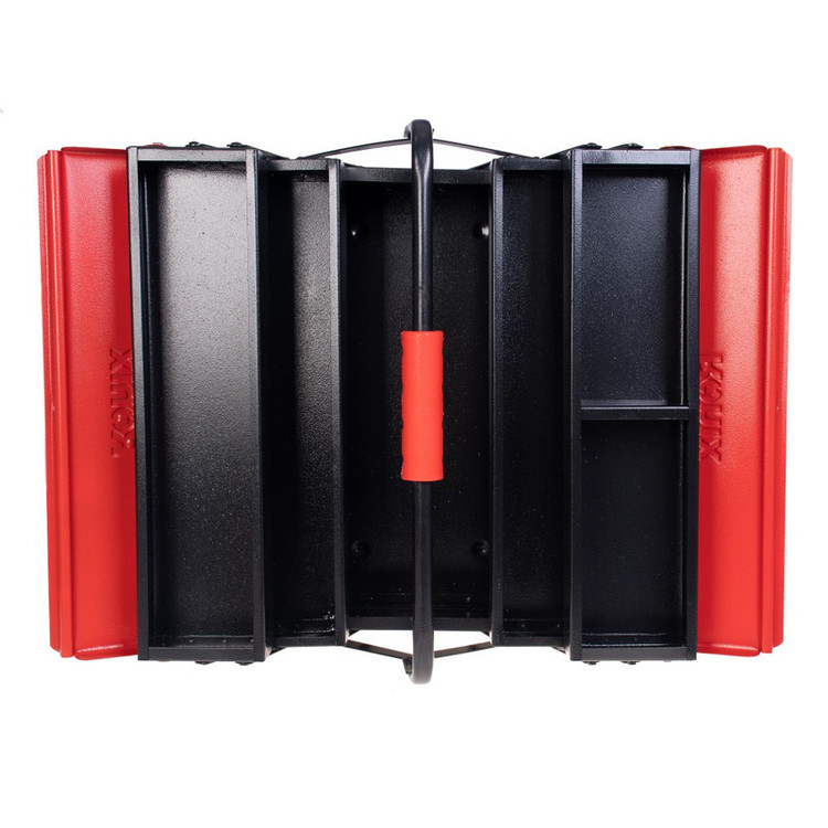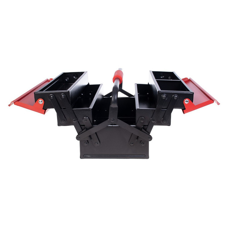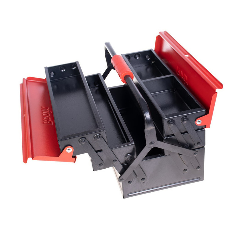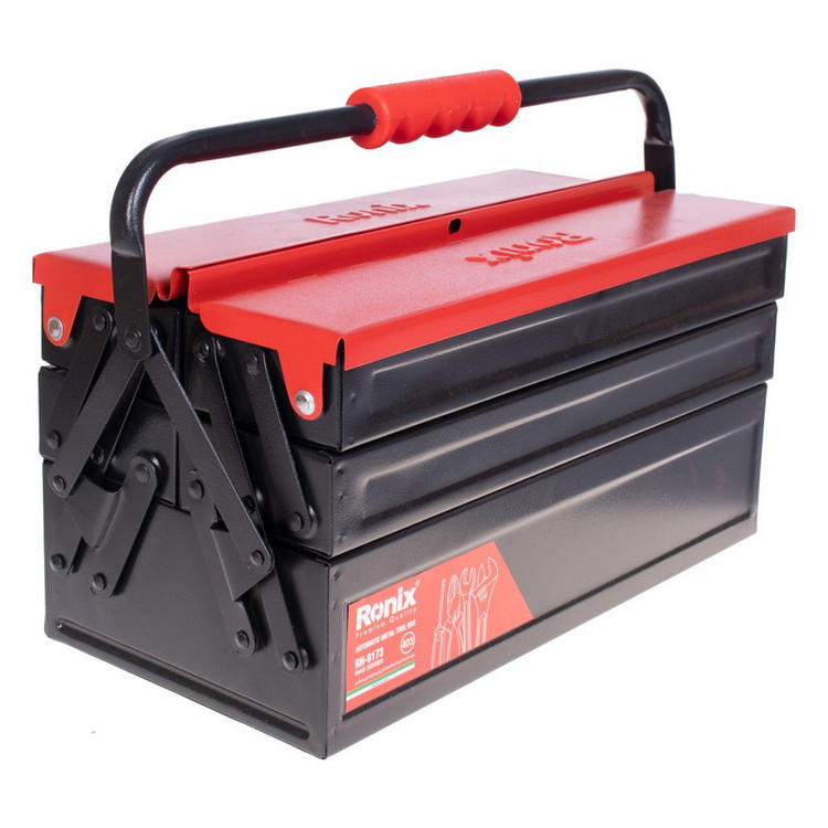 جعبه ابزار فلزی 3 طبقه 40 سانتی متری رونیکس به طور کامل از ورق فولاد ضد زنگ و مقاوم تولید شده است و اتصالات آن که به صورت پین شده هستند، در تمام قسمت های جعبه ابزار، به صورت با کیفیت و مرغوب ایجاد شده اند تا شما با خیال راحت بتوانید ابزارهای کوچک و متوسط خود از جمله انواع پیچ و مهره و آچار و انبر و انواع ابزار دستی مختلف را در درون آن جایگذاری کنید و آن ها را در خانه نگه دارید و یا به محل کار و فعالیت خود ببرید. دستهی فلزی مقاوم این جعبه ابزار رونیکس نیز که با روکش ABS پوشانده شده است، باعث میشود تا در هنگام حمل و نقل ابزارها در داخل این جعبه ابزار با راحتی زیادی مواجه شوید و از بسیاری دشواریهای حمل جعبه ابزار راحت شوید. رنگآمیزی بدنهی این جعبه ابزار رونیکس فلزی به صورت کوره ای الکترواستاتیک انجام شده است. این گونه رنگکاری باکیفیت و صنعتی، باعث میشود تا دوام این جعبه ابزار بسیار بالا برود و در هنگام حمل و نقل و یا گذاشتن برداشتن اجسام و ابزارها در داخل آن، ایجاد خط و خش و خراشیدگی در بدنه و سطح داخلی این جعبه ابزار صورت نگیرد. درب بالایی و اصلی این جعبه ابزار یکی از مشخصات خوب این وسیله است زیرا یک در تر و تمیز اتوماتیک است که به شکل کاملا منظم باز و بسته میشود تا 6 محفظهی کوچک و بزرگ این جعبه ابزار را که با اندازههای مختلف در سه طبقهی جعبه در کنار هم و به شکل منظم قرار گرفته اند را به درستی بپوشاند. سایز این جعبه ابزار ساخت ایران 40 سانتیمتر است و دارای وزن 4460 گرم است که برای یک جعبه ابزار فلزی مقاوم وزن خوبی محسوب میشود. ابعاد این جعبه ابزار فلزی مشکی-قرمز رنگ هم برابر 20.5×20.5×40 سانتیمتر میباشد که در نتیجه حجم خوبی را در درون خود برای قرارگیری انواع ابزار به نمایش میگذارد.