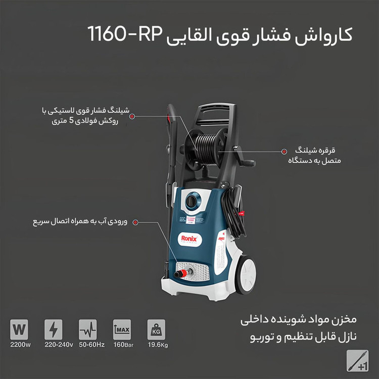 دستگاهی که پیش در تصویر میبینید، کارواش خانگی است که شرکت «رونیکس» (Ronix) تولیدکنندهی آن به شمار میآید. این شرکت این محصول را با نام RP-1160 عرضه میکند. یک موتور قدرتمند، اصلیترین قسمت این دستگاه است که سرعت (دبی) و فشار آب خروجی را تامین میکند. میزان استهلاک دستگاه و موتور بسیار پایین است. جابجایی دستگاه به سهولت انجام میشود. شکل پاشش آب خروجی هم به کمک این لوازم جانبی دستگاه امکانپذیر است. کارواش خانگی مدل RP-1160، دارای یک موتور القایی با قدرت 2200 وات است. این موتور فشار آب خروجی را به 160 بار میرساند. سرعت یا در اصطلاح دبی آب خروجی در حدود 7.3 لیتر بر دقیقه است. طراحی ارگونومیک دستگاه باعث میشود که شما بدون نیاز به کسب کمترین مهارت، از محصول استفاده کنید. برای جمعکردن شلنگ 5 متری هم میتوانید از قرقرهای که به این منظور روی دستگاه قرار دادهشده، کمک بگیرید. برای دستیابی به حد مطلوبتر تمیزی، میتوانید از مواد شوینده در زمان پاشش آب، استفاده کنید. جهت جابجایی آسان و سریع ، یک دستهی پلاستیکی و یک جفت چرخ برای این دستگاه در نظر گرفتهاند. دو لنس قابل تنظیم هم بهعنوان لوازم جانبی، در کنار محصول قرارگرفته است. از دستگاه کارواش خانگی برای نظافت و شستشوی محوطه منزل، محل کار یا شستشوی خودرو و هر وسیلهی نقلیهی دیگر استفاده میکنند. برای استفاده از این دستگاه نیازی به مهارت چندانی نیست. تهیه این محصول کمک بسیار زیادی به کسانی است که اهمیت بیشتری به نظافت و تمیزی میدهند. Ronix کارواش مدل RP-1160 را با موتور 2200 واتی که تامینکنندهی فشار 160 باری آب خروجی است، تولید میکند.